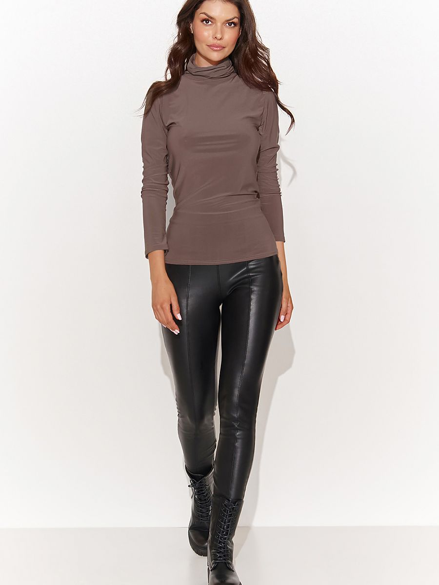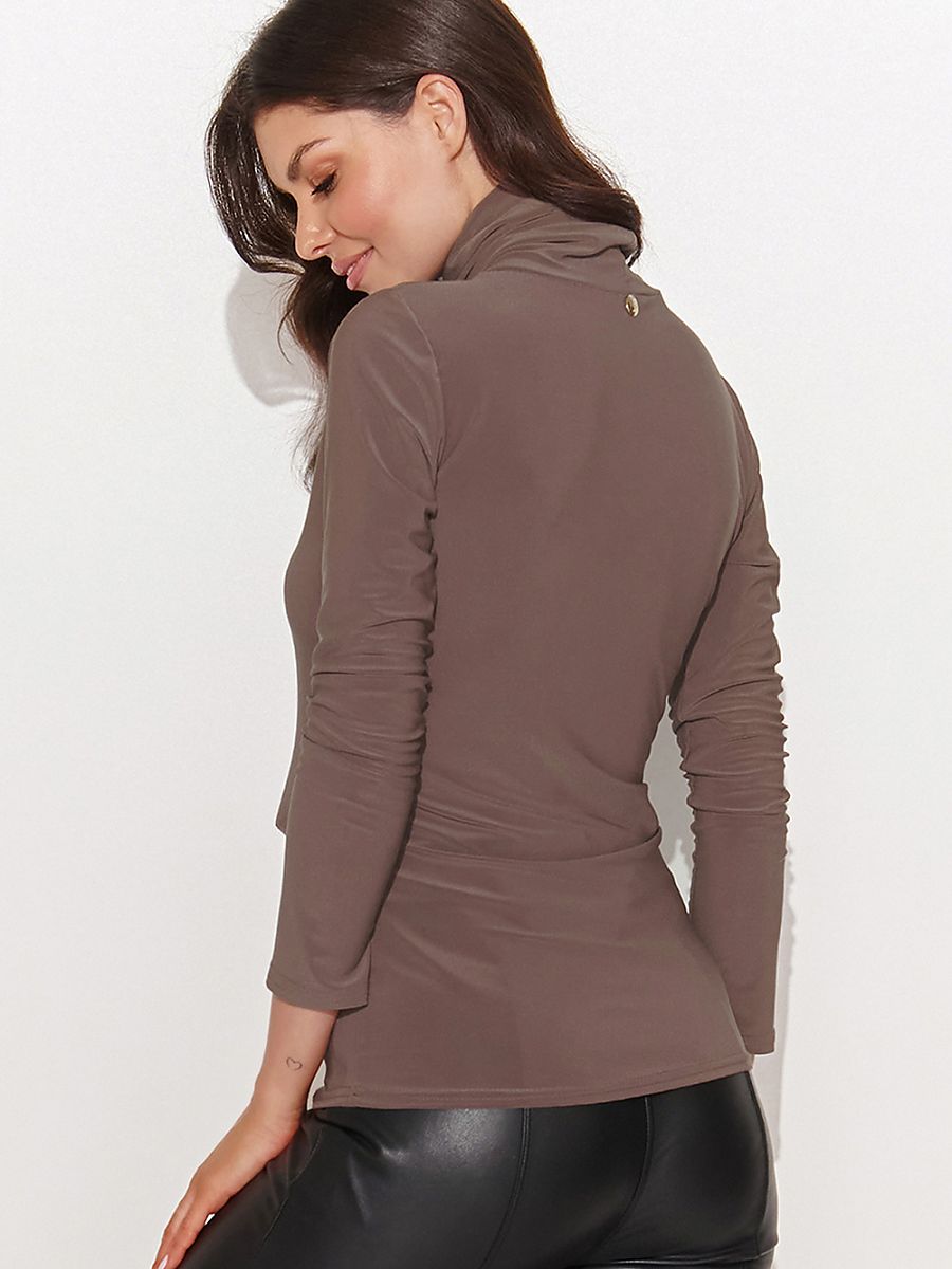 Functional women’s blouse made of stretchy, opaque fabric is a classic among blouses. The neckline in the form of a practical turtleneck, combined with long sleeves, will wrap you up on colder days. While the gold-plated tinsel in the upper part of the back, adds to its subtle elegance. Thanks to its simple form, it perfectly finds its way into casual styling, which you can wear both to the office and out on the town. The women’s turtleneck goes perfectly with both tailored pants and mom fit pants. This blouse is a combination of functionality and elegance in effect giving you a successful recipe for a look.