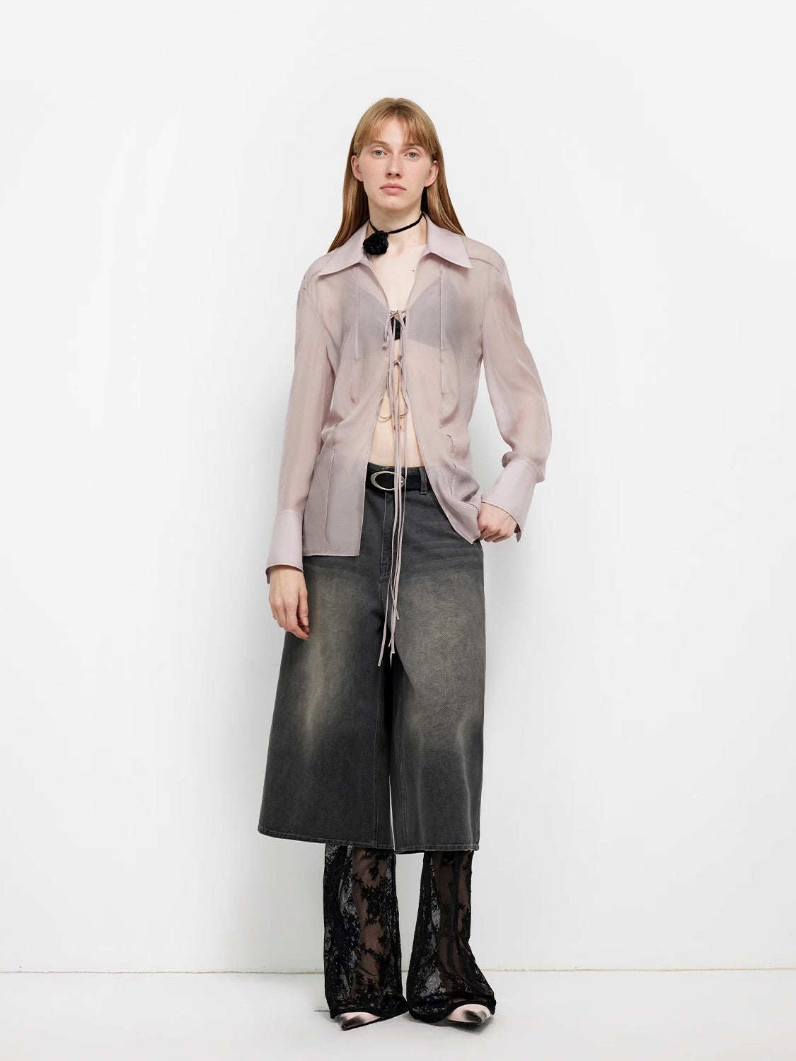 Flowing and carefree, this loose-fit, drop-shoulder, slightly cinched-waist long-sleeve shirt is crafted with a 3D tailored silhouette, a high-difficulty design that creates a paper-thin, elegant effect. It effortlessly exudes a relaxed and stylish atmosphere. The simple yet carefree tie-front closure adds a touch of ease and romantic flair. The classic pointed collar is precisely tailored, enhancing a refined and polished feminine aura.