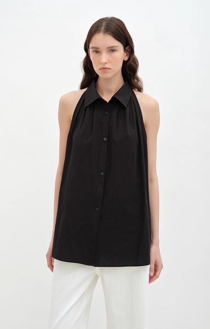 High-quality cotton fiber, high-density weaving, skin-friendly and breathable, post-finishing process creates a hemp-feeling style, refreshing and classic shirt, stand-up collar, fashionable and stylish, hollow shoulder, sleeveless shape, refreshing and fashionable, more elegant posture, collar pleat shape, add design sense, small A-line version, add elegant temperament, loose and slim.