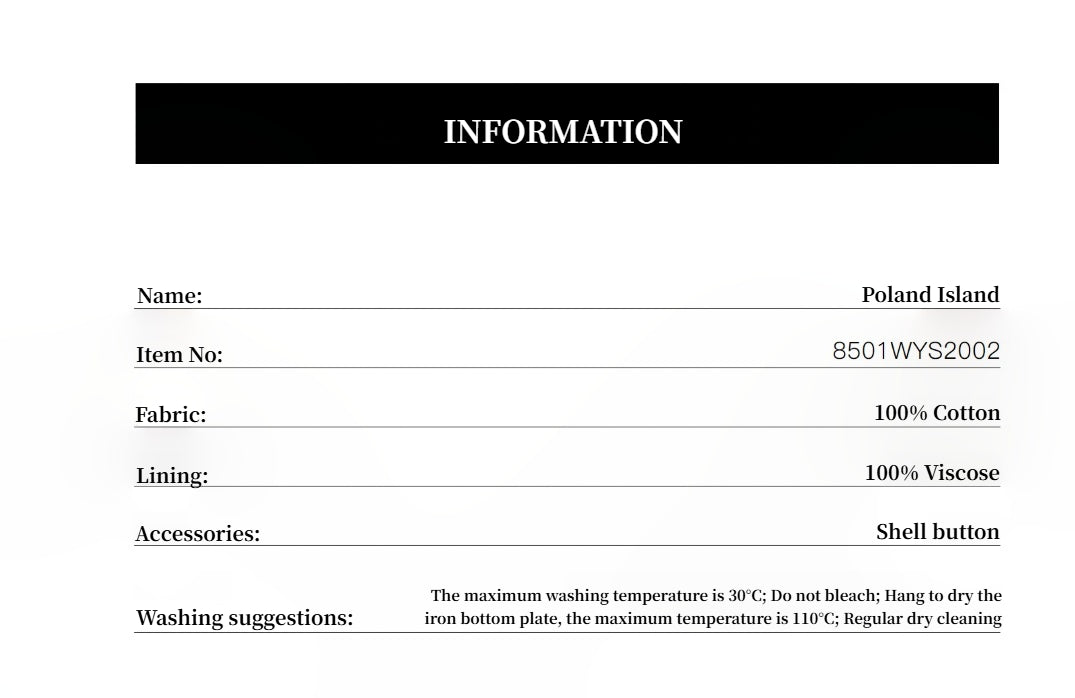 High-quality cotton fiber raw material, moisture-absorbing and breathable, high-density woven fabric surface is flat and neat, skin-friendly and comfortable without losing the sense of bone, fine textile technology makes the fabric smooth and stylish. The post-finishing process creates a unique linen style, the fabric texture is richer and more layered, and the ready-made clothes have a unique retro and fashionable style.
