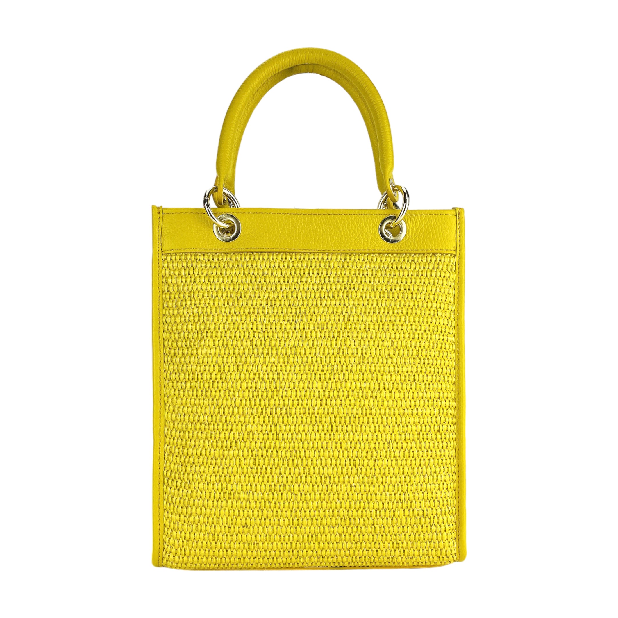 RB1026R | Borsa Donna a mano verticale in Vera Pelle e Paglia Made in Italy. Tracolla removibile e regolabile in pelle. Accessori Oro Lucido – Colore Giallo – Dimensioni: cm 24 x 29 x 9