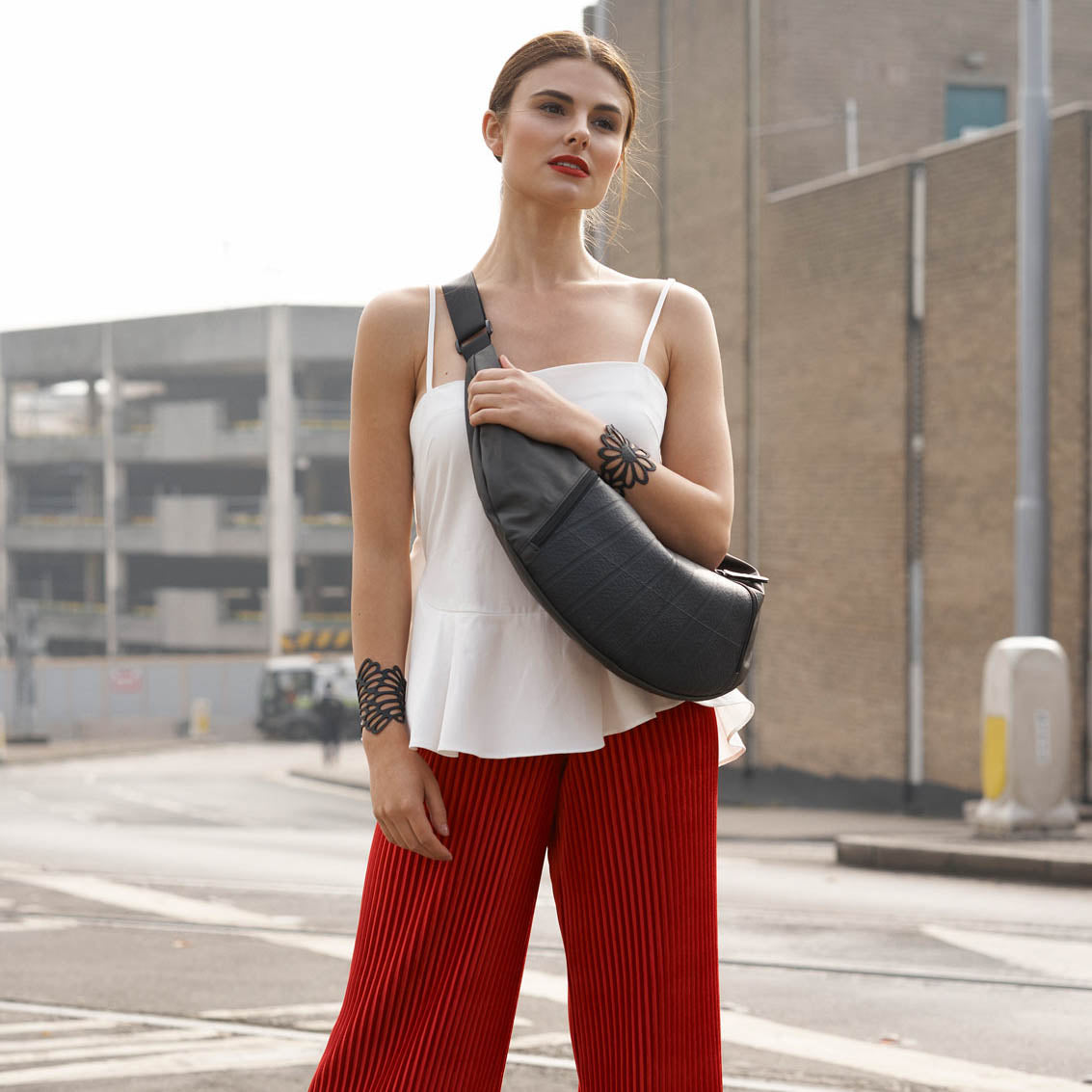 The hobo bag is handmade using reclaimed military canvas and recycled rubber from tyre inner tubes. It is made in a way that is both eco-friendly and cruelty-free.